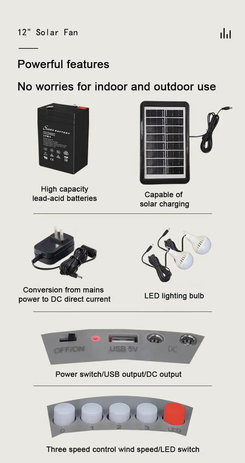High Quality Home Use Cooling Battery Solar Electric Table Fan Rechargeable DC 12 Inch Wind Solar Fan with LED Lamp